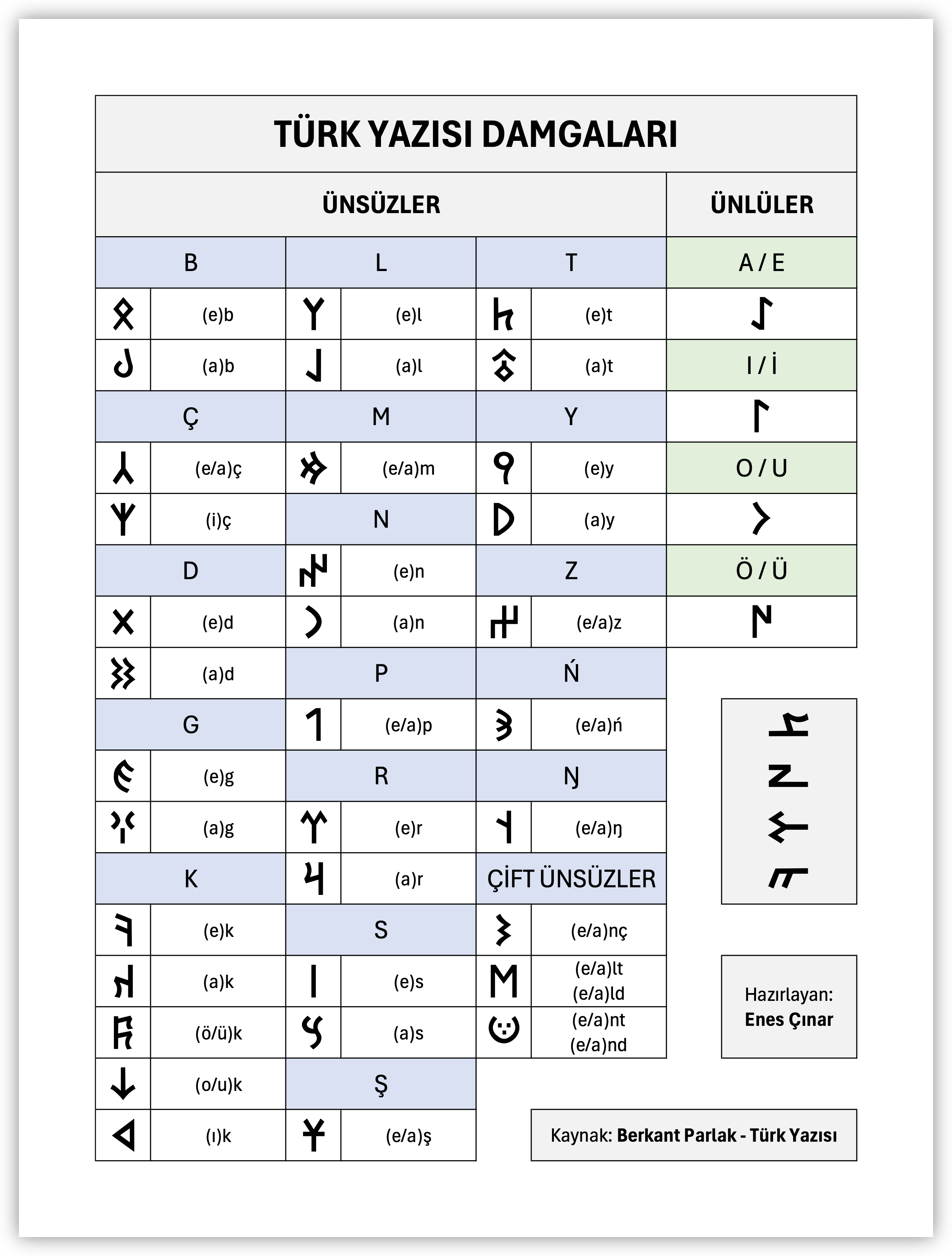 Aşağıdaki tabloda, Türk yazısına ait damgalar ve bu damgaların okunuşları yer almaktadır: